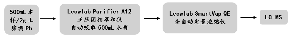 2、活化柱子,采用Leowlab Purifier A12正压固相萃取仪将500mL水样自动吸取上样,淋洗、洗脱。