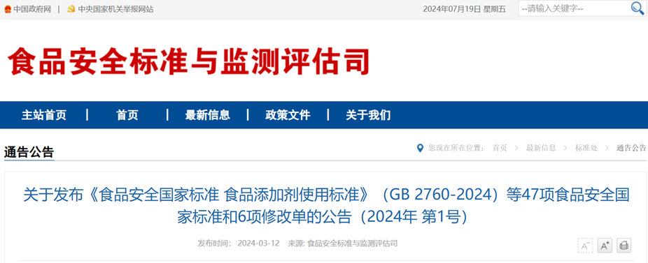 国家卫生健康委员会 国家市场监督管理总局发布《食品安全国家标准 食品添加剂使用标准》(GB 2760-2024)等47项食品安全国家标准和6项修改单的公告(2024年 第1号)其中包括GB 5009.299-2024《食品安全国家标准 食品中乳铁蛋白的测定》,该标准于2024年8月8日正式实施。