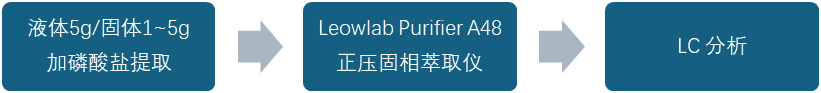 2、活化柱子,准确移取10mL样液到Leowlab Purifier A48正压固相萃取仪,通过调节低压阀,控制流速在1mL/min~3mL/min,待样液滴完,用磷酸盐缓冲液Ⅱ淋洗,下接10ml玻璃管/15ml离心管,用5mL磷酸盐缓冲液Ⅰ洗脱,再用磷酸盐缓冲液定容至5mL,过水膜,待上机。