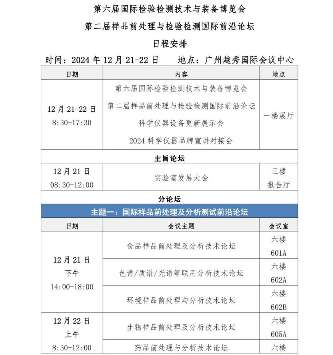 12月21日-22日,第六届国际检验检测技术与装备博览会(简称“检博会”)将在广州隆重举行,与SPFE2024第二届样品前处理与检验检测国际前沿论坛、全国首届实验室设备更新及供应链采购对接展览会三大重要活动联合举办,旨在共同打造一个前沿仪器展示交流、合作采购、学术研讨的综合性展览会。大会将举办25场专业分论坛,来自全国各科学仪器行业的精英人士汇聚一堂,共同探讨行业发展趋势和技术创新。
