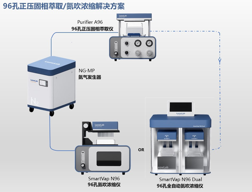 针对目前固相萃取法的普遍缺点,莱奥提出了96孔正压固相萃取&氮吹浓缩解决方案。