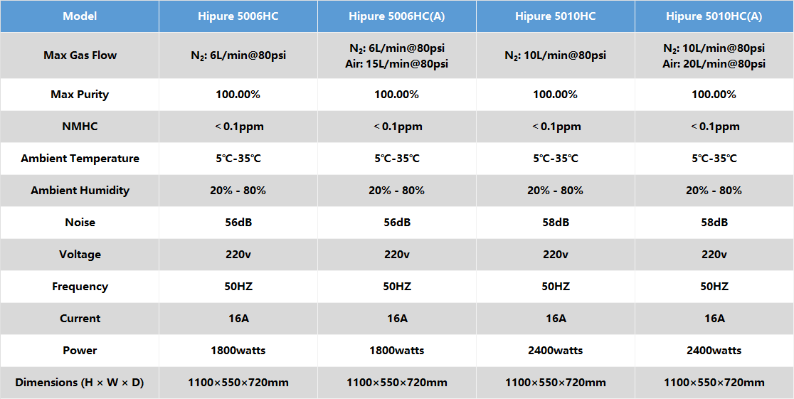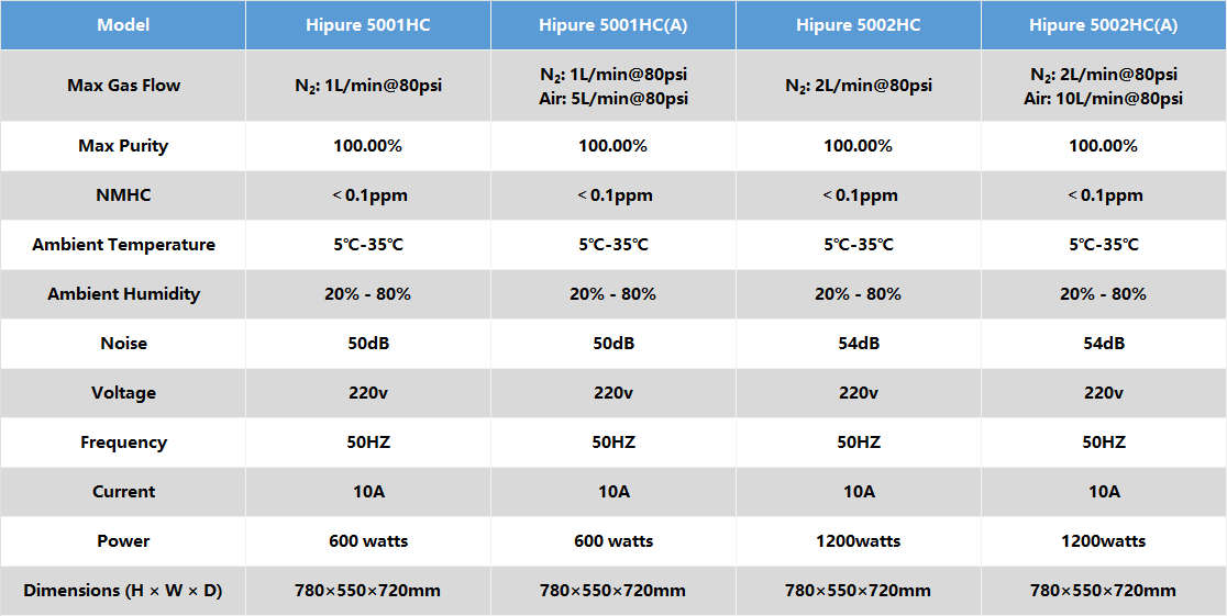 The Hipure series Nitrogen Generators are specifically designed for high-purity nitrogen. They adopt pressure swing adsorption (PSA) with carbon molecular sieve technology. The high-purity nitrogen can serve as the carrier gas and make-up gas for gas chromatography (GC), while the generated air can act as the combustion-supporting gas for GC.