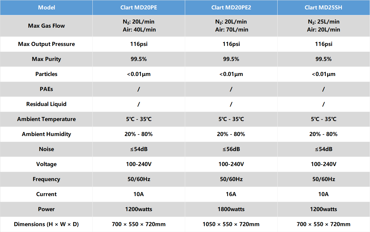 The Clart MD series nitrogen generators adopt ultra-fine hollow fiber membrane separation technology. They can simultaneously supply high-purity nitrogen and air for LC-MS of brands such as Shimadzu, PE, and operate stably for a long time.
