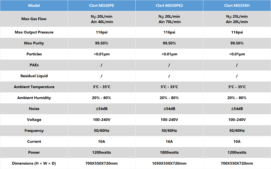 The Clart MD series nitrogen generators adopt ultra-fine hollow fiber membrane separation technology. They can simultaneously supply high-purity nitrogen and air for LC-MS of brands such as Shimadzu, PE, and operate stably for a long time.