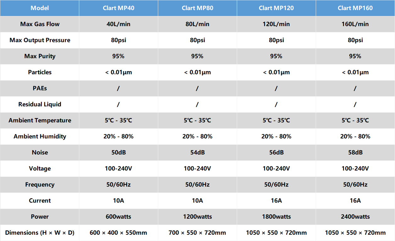 The Clart MP series nitrogen generator adopts ultra-fine hollow fiber membrane separation technology. Specifically designed for pretreatment equipments such as nitrogen evaporator, They meet the usage demand for high-flow nitrogen.