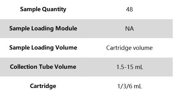Purifier A48 is suitable for high-throughput extraction and purification of samples such as food, pharmaceuticals, environment, and forensic toxicants, and can complete the entire SPE process including activation, sample loading, rinsing and elution. Compared with negative pressure devices, it provides higher pressure (up to 100 psi) with controllable flow rate, excellent repeatability and recovery rate, thus being highly favored by experimenters.