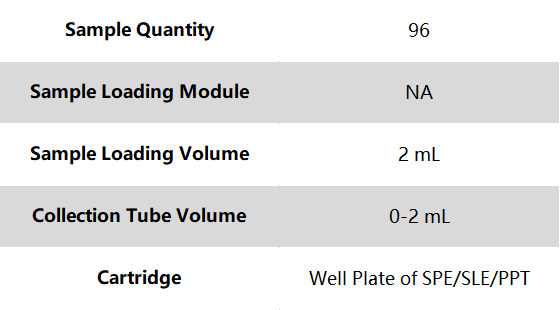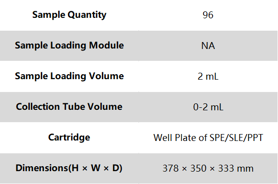 It is a high-throughput extraction and purification device specially designed for clinical and biological samples, compatible with SPE plates, SLE plates and PPT plates of different brands. Purifier A96 can provide pressure up to 100 psi, enabling easy extraction even of viscous samples and effectively improving sample recovery rate.